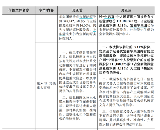 在更正及致歉公告中,宝新能源则补充披露“本次协议转让的5.11%股份,实质是宁远喜代宝丽华集团持有的宝新能源股份,即通过该次股权转让过户到‘宁远喜’个人股票账户的宝新能源股份。”;并将“本次宁远喜受让所需资金未直接或者间接来源于宝新能源及其关联方”中的“及其关联方”删除。