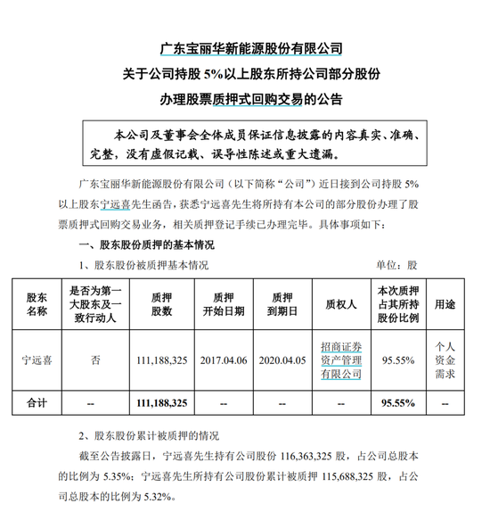 值得注意的是,据宝新能源公告显示,2017年4月,宁远喜从宝丽华集团“受让”的股票随即全部被质押。