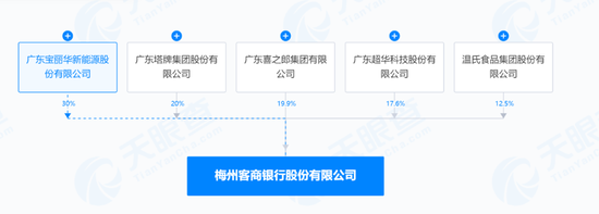 据天眼查显示,自2017年成立以来,梅州客商银行的股权结构未曾有变化——宝新能源,持股30%;塔牌集团,持股20%;喜之郎集团,持股19.9%;*ST超华,持股17.6%;温氏股份,持股12.5%。